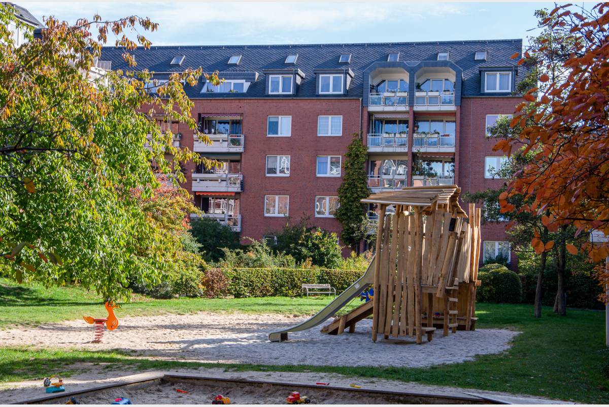 Neubau mit grünem Innenhof. Nur wenige Schritte entfernt, befinden sich der Spielplatz mit großer Spielburg, Sandfläche und Wipptieren und der Zugang zur Tiefgarage.